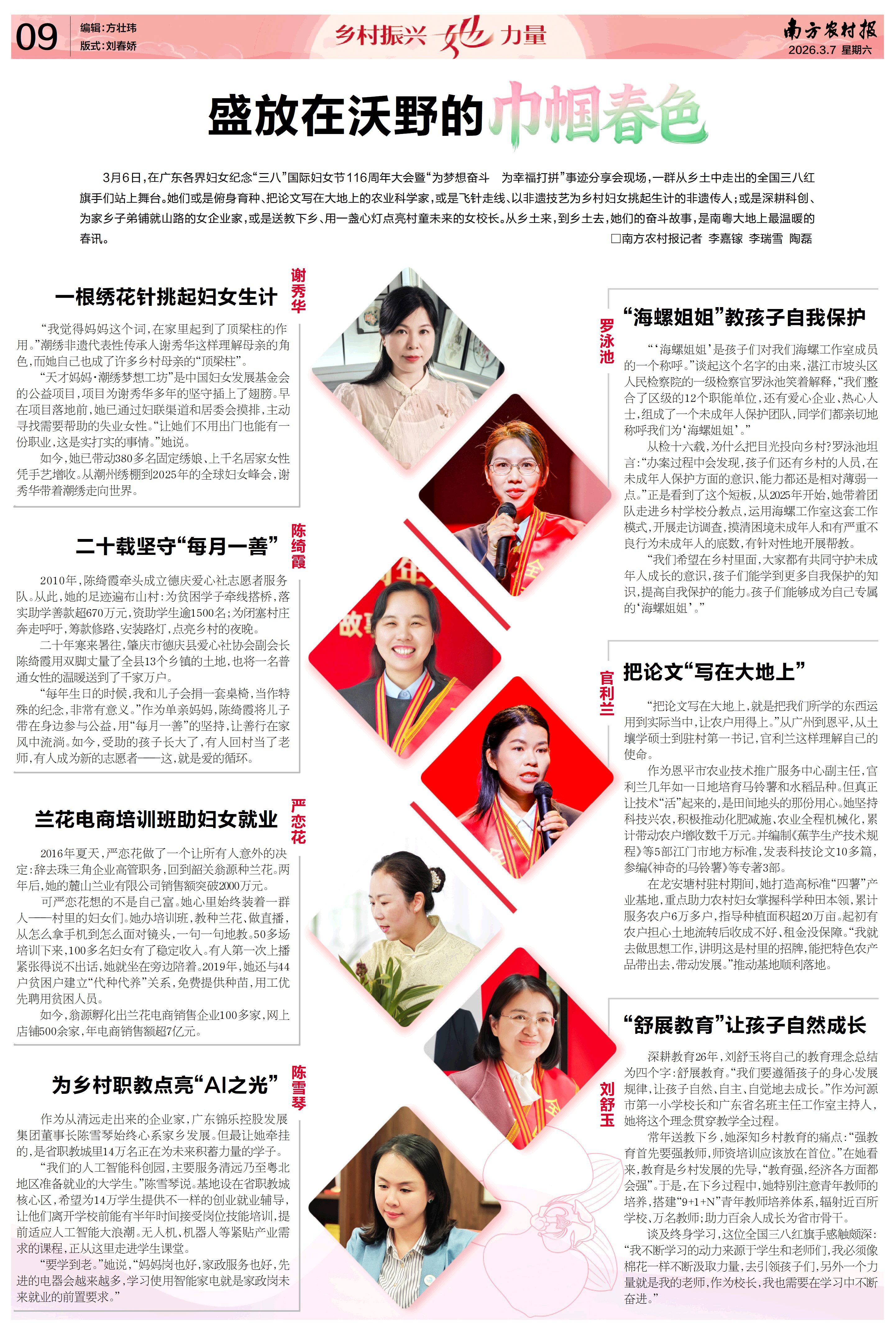 她们从乡土中走来,又扎根乡土、反哺乡土。在乡村振兴的广阔天地里,广东的优秀女性正以各自的方式书写着时代的答卷。无论是非遗传承的一针一线,农业科研的一田一垄,还是普法教育的一言一语,人才培养的一心一意,她们用奋斗诠释着“巾帼不让须眉”的力量。乡土之上,芳华绽放;梦想在前,步履不停。